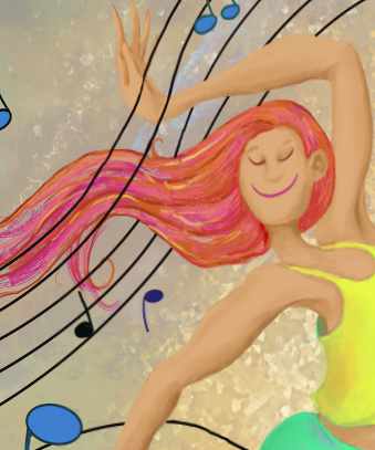Denne ble laget etter inspirasjon av en danseforestilling, samtidig er den også en hyllest til de flotte, sterke damene jeg kjenner. Trykket har en veldig positiv energi.