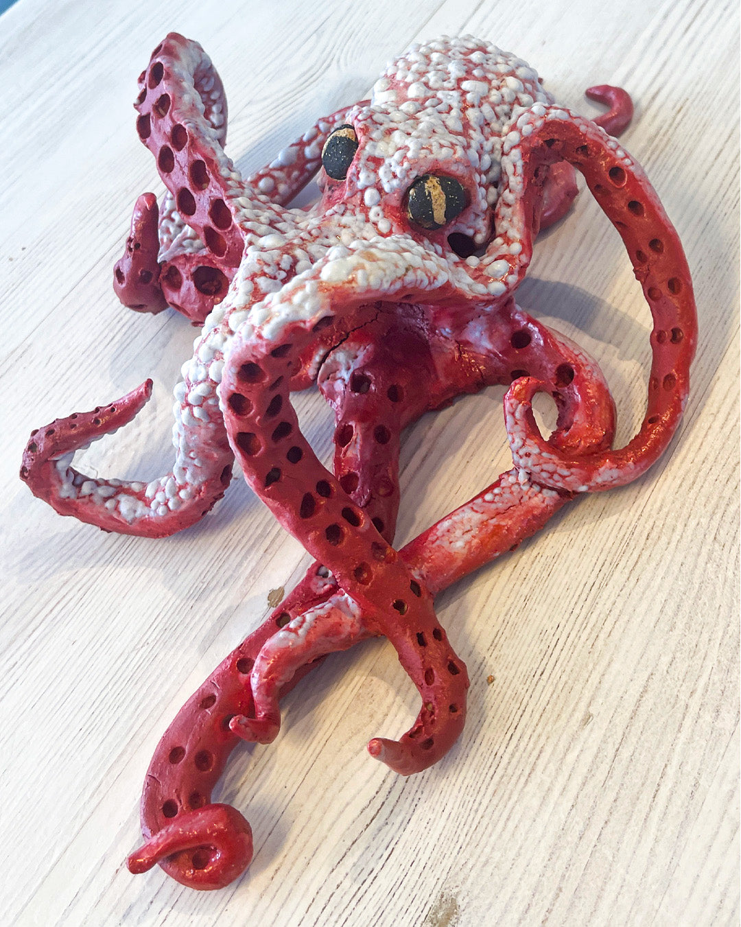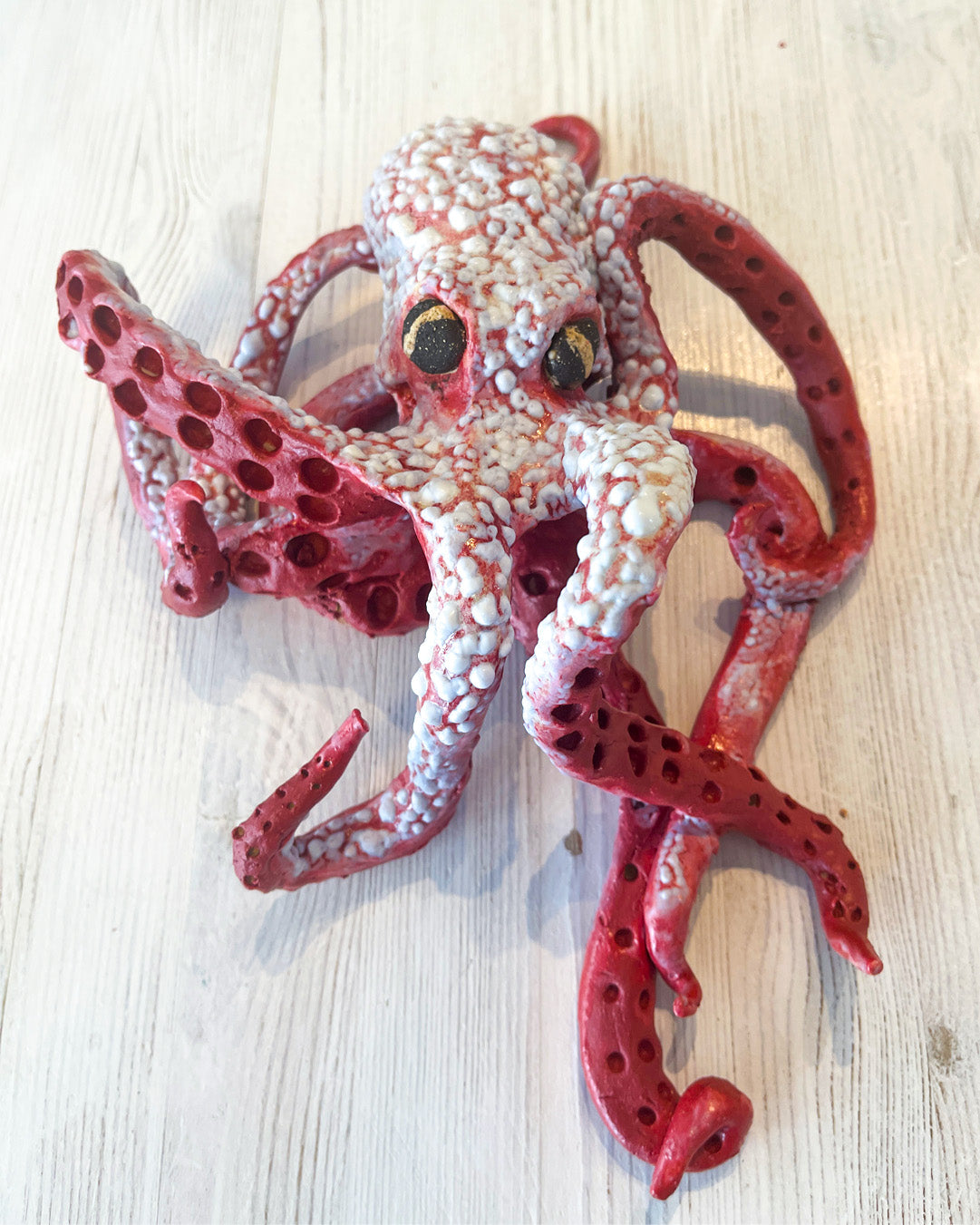 Liten rød blekksprut med hvit overglasur. Laget i steingodsleire og glasert.