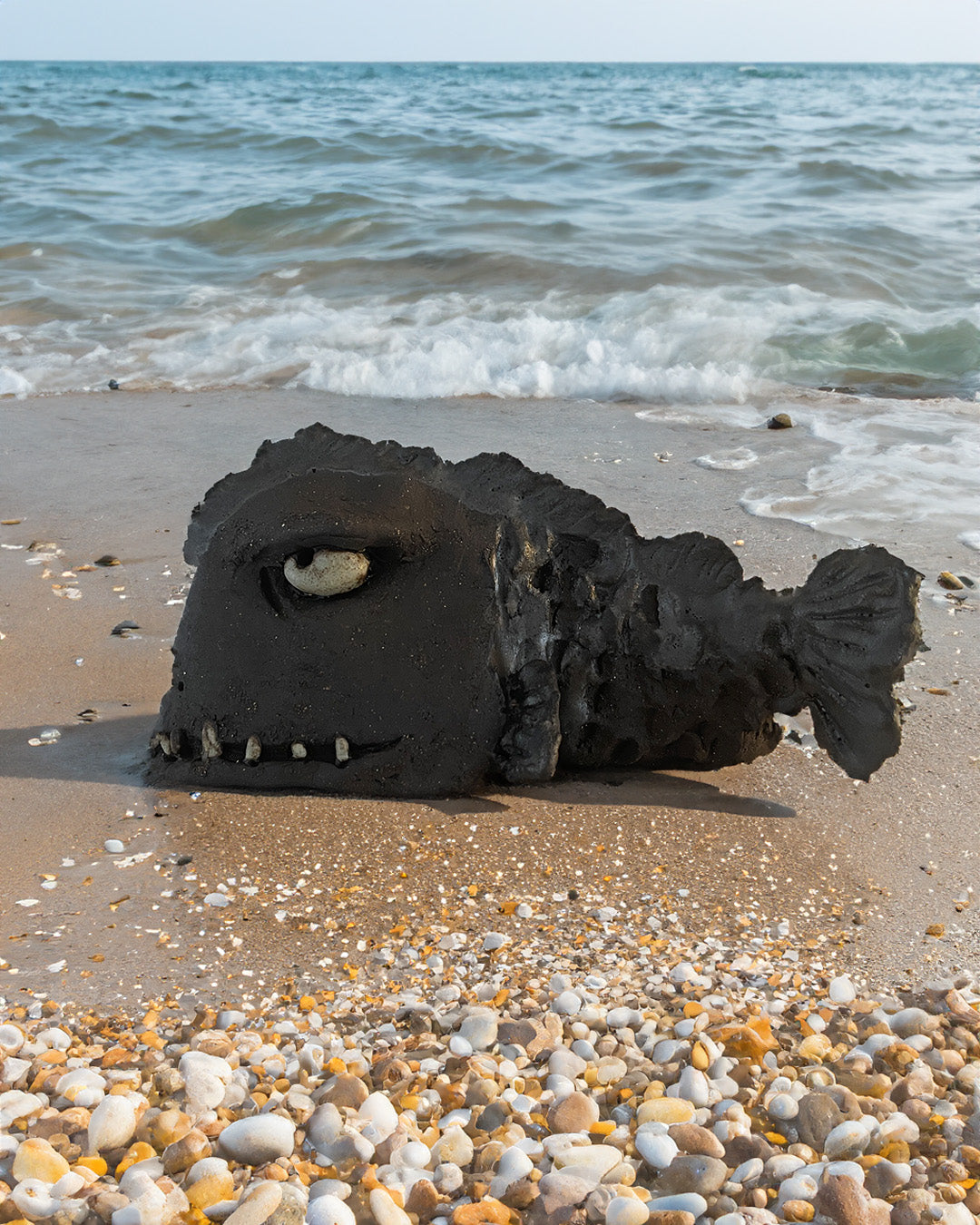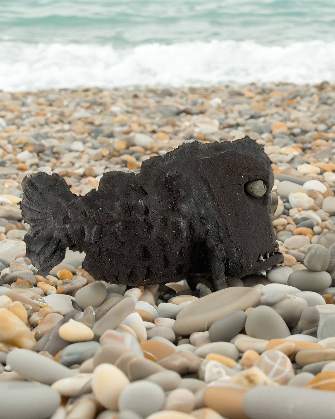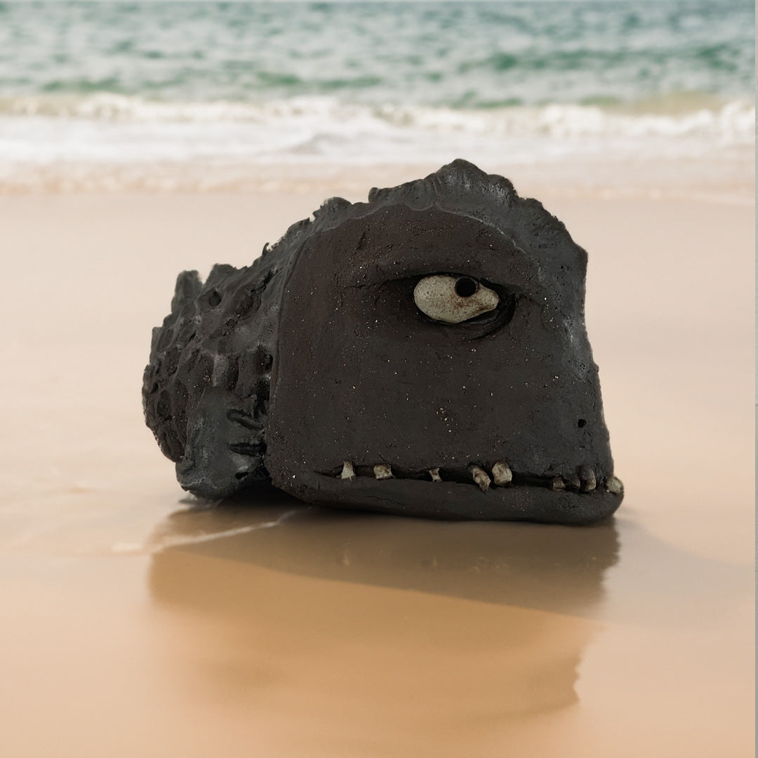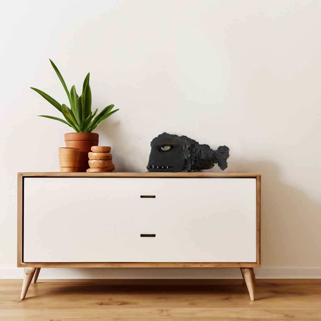 Unik skulptur i svart leire. Skulpturen er glasert; øyne, tenner og finner. Fargen på finnene er ikke fremtredende. Denne har sølvgrå finner. Den har hull under slik at den kan settes på stativ.