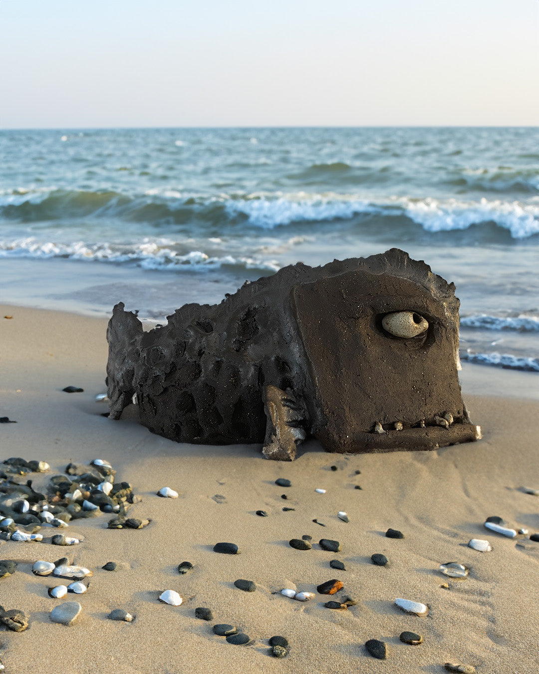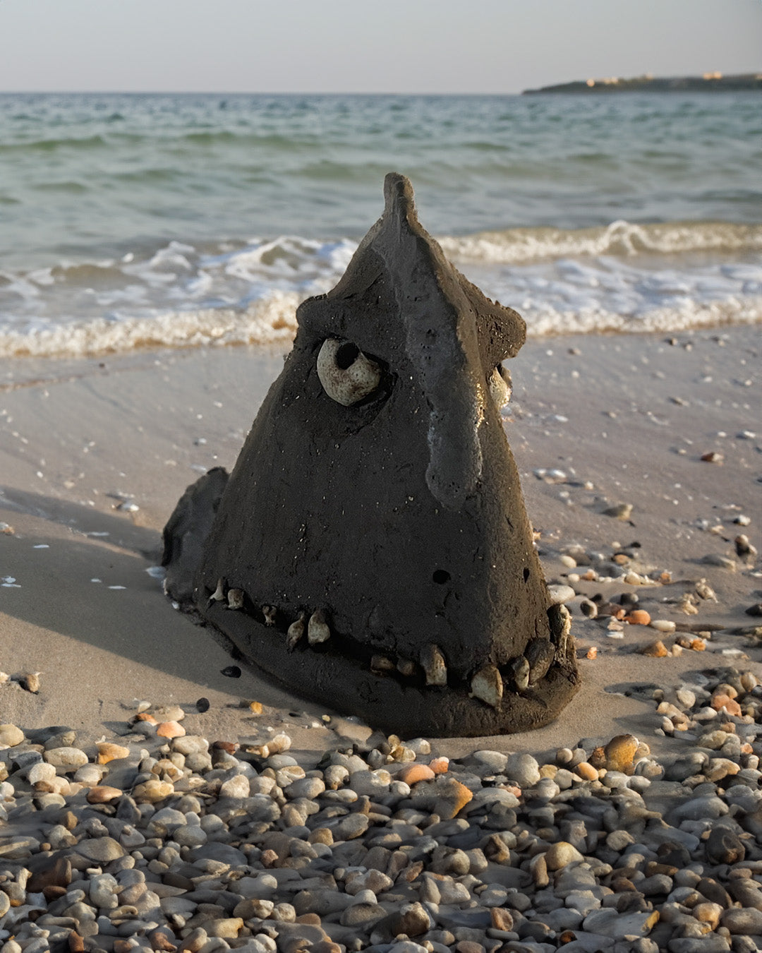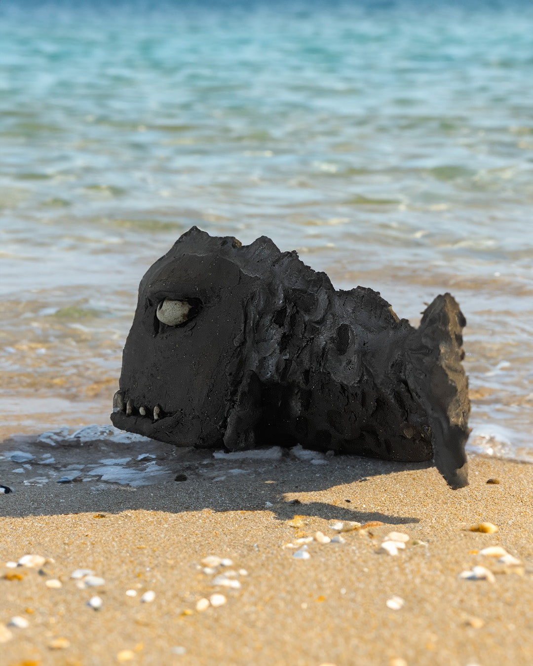 Unik skulptur i svart leire. Skulpturen er glasert; øyne, tenner og finner. Fargen på finnene er ikke fremtredende. Denne har sølvgrå finner. Den har hull under slik at den kan settes på stativ.