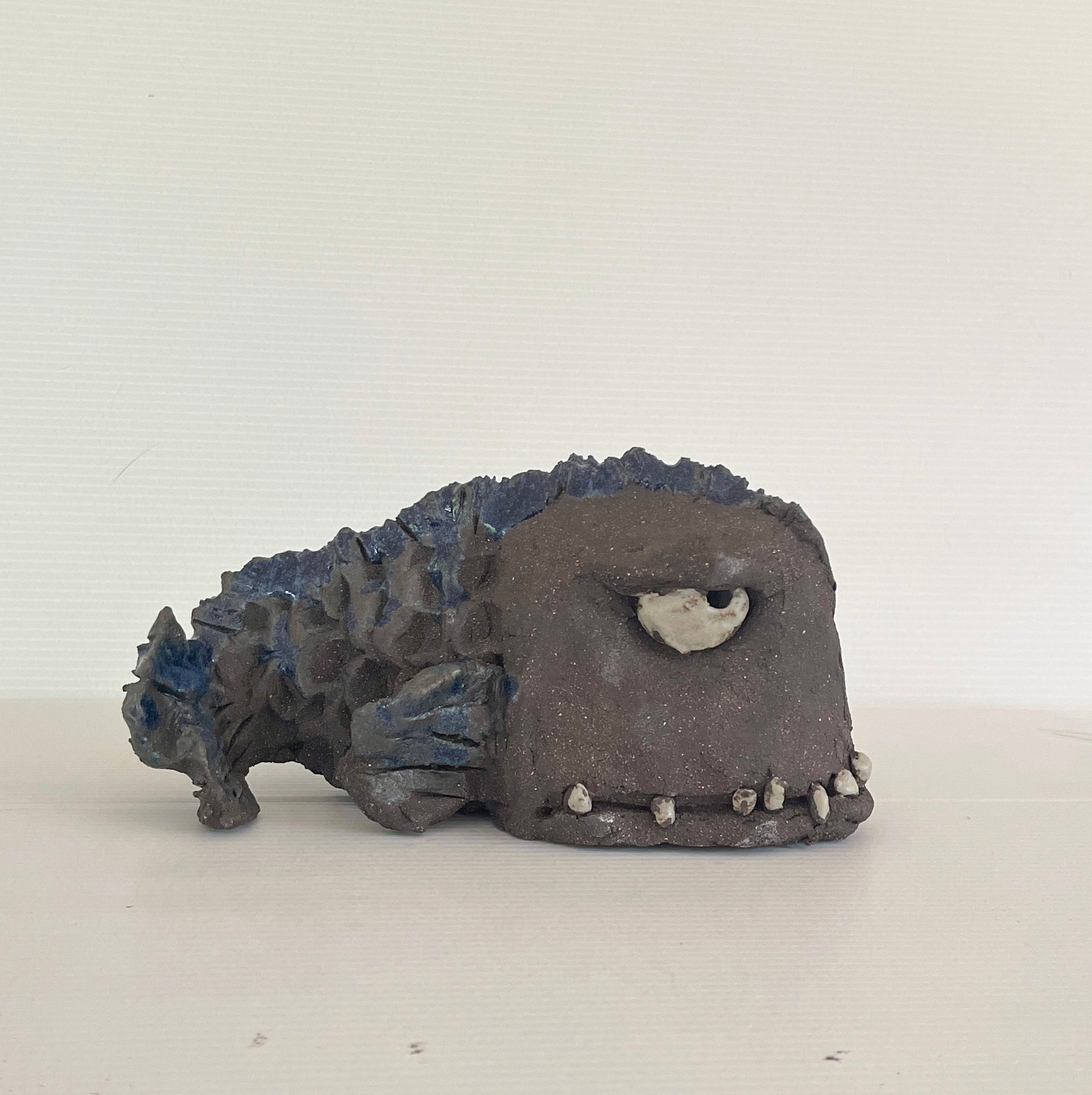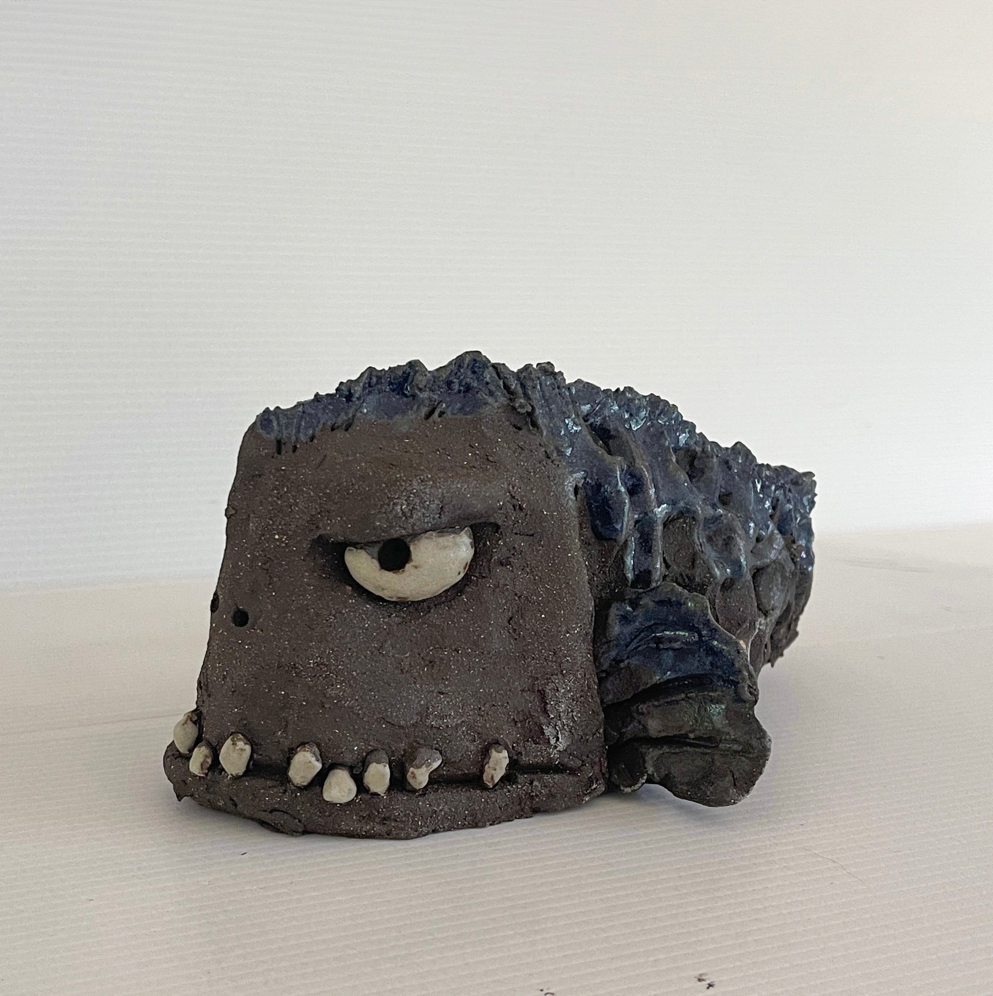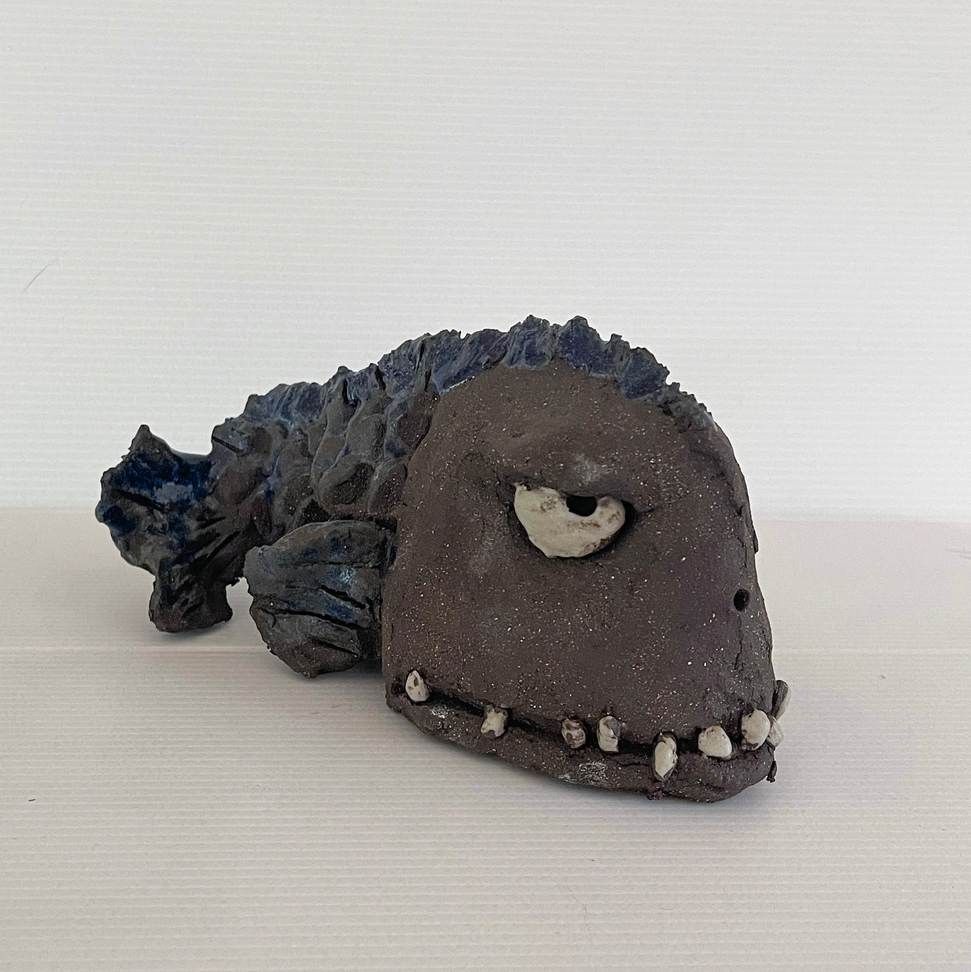 Unik skulptur av steinbit i svart leire. Skulpturen er glasert; øyne, tenner og finner. Fargen på finnene er ikke fremtredende. Denne har blå finner. Den har hull under slik at den kan settes på stativ.