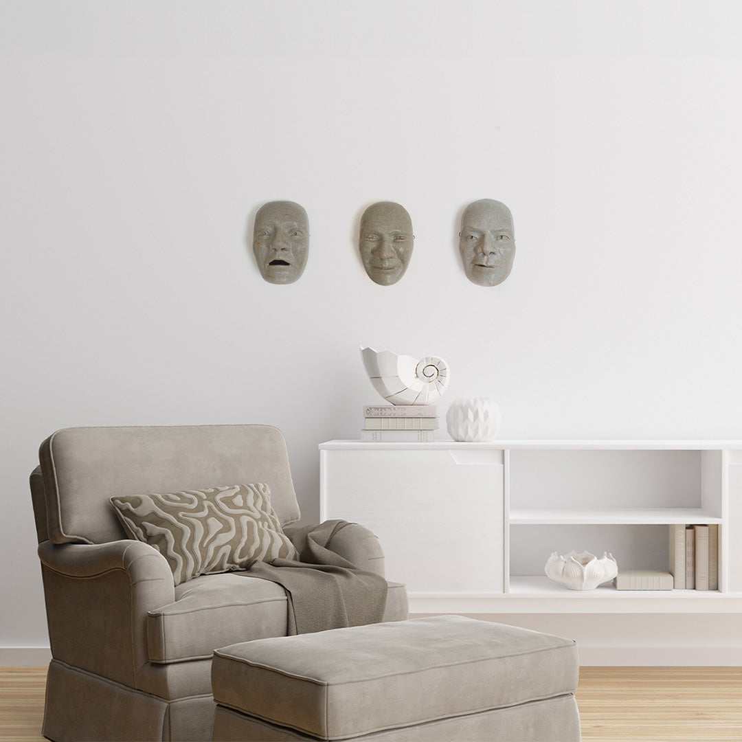 Ansikt med forskjellige uttrykk, formet i leire og glasert. Henges på vegg. Kan henges alene eller sammen med andre ansiktsuttrykk. Hver skulptur er unik.