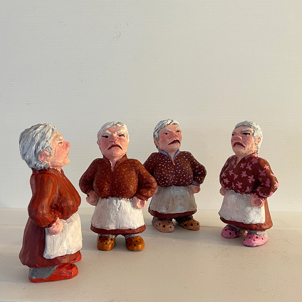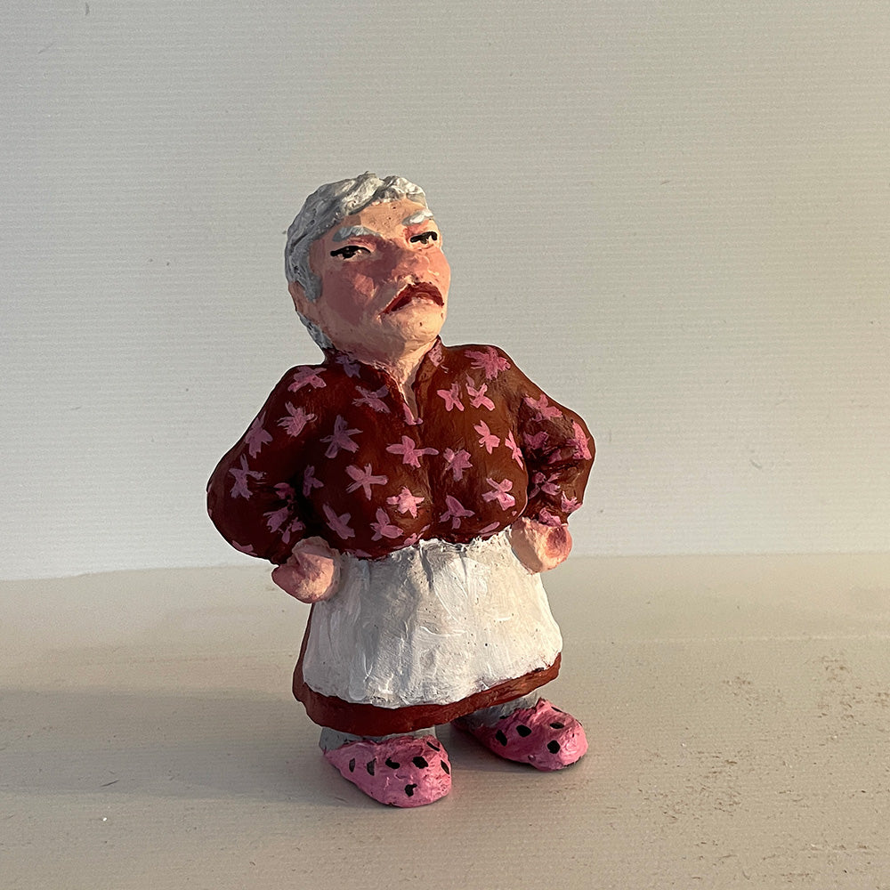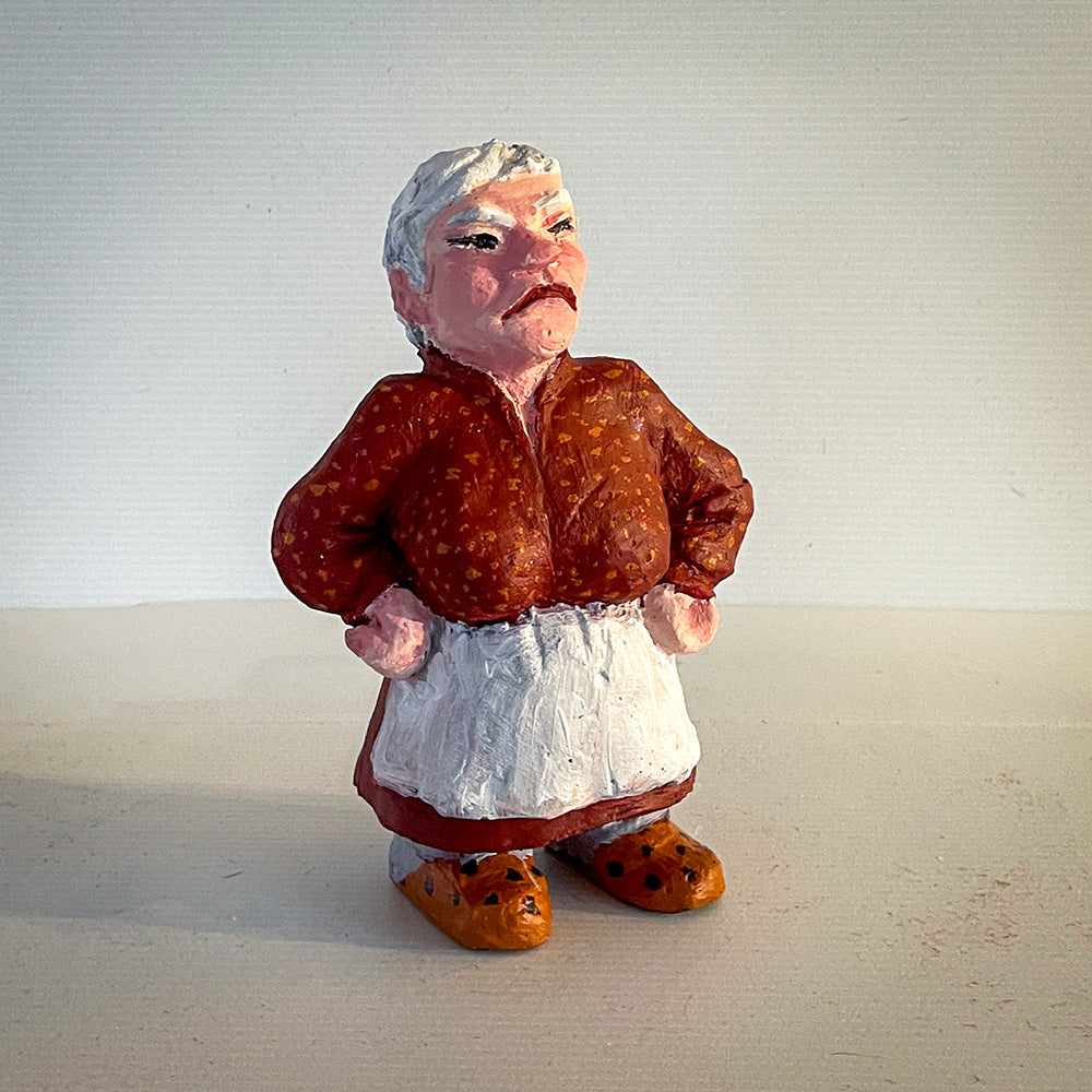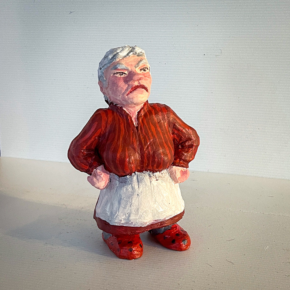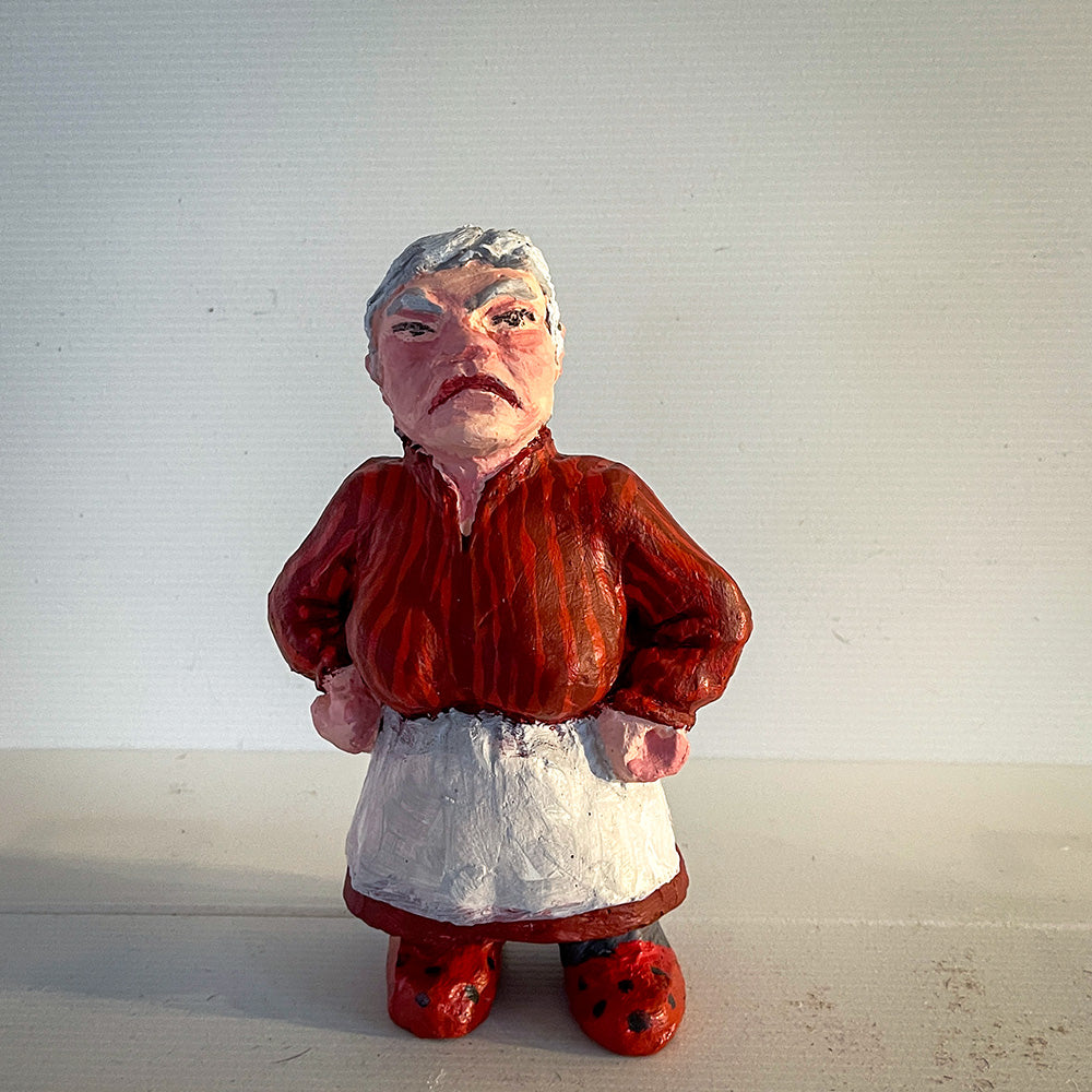 Høyde 18 cm. Hun passer sammen med tykk- og sovende nisse, og hun har eget julekort: Nissemor